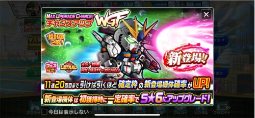 10.8-10.22 MAX UPGRADE CHANCE!チャンスアップWGF 10.15-10.29 新機体登場!MAX UPGRADE CHANCE!セレクトガシャフェスティバル 10.16-10.31 ハロウィン!回数別おまけ付き1日1回11連無料ガシャフェスティバル 10.22-11.5 新機体登場!MAX UPGRADE CHANCE…